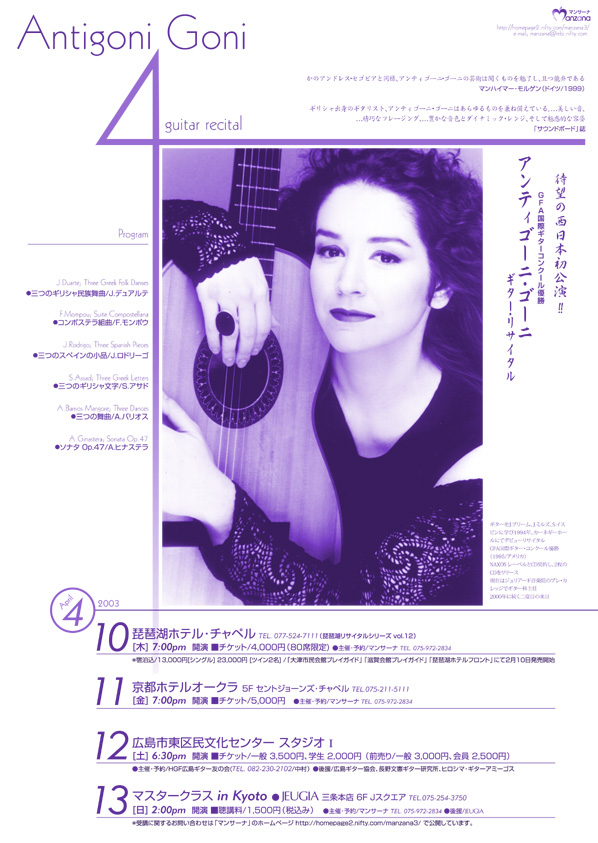 セルジオ・アサド[1952年生まれ] /3つのギリシャ文字 アサドは、ブラジルの作曲家であり、名ギタリスト。弟のオダイルとのデュオでよく知られている。この曲はアンティゴーニ・ゴーニに捧げられた。アサドは説明する。「ご存知のとおり、古いギリシャ語は、西欧の言葉や思考に深く影響を与えました。これらの記号は、アルファやベータから、A,Bが導かれるアルファベットのような単純な概念を現わす他、無理数や興味深いパイのような、理論的な数学や、シグマと名付けられた分子のような自然の相互作用といった複雑な西欧的な思考から、しばしばサイ(Psi)で現わされる最も深い人類の秘密をも解き明かしているのです。3部から成る『3つのギリシャ文字』はこのサイ、パイとシグマの音の自由な結合です。サイ(ψ)の文字は、パイ(π)とシグマ(Σ)の音を混ぜ合わせた様で、この曲の第1部です。サイ(ψ)は、3つの部分から成り、第2部、第3部で、さらに発展するパイ(π)とシグマ(Σ)といった2つの対照的なテーマを混ぜ合わせています。これらの作品は、調性音楽とリディア旋法を統合し、更に半音階技法を味付けとして加えている。」