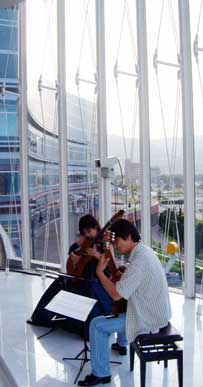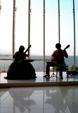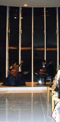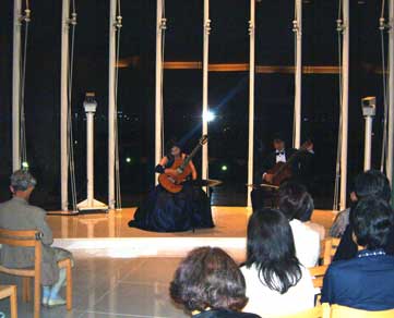 Guitar Duo の為に書かれた日本人作曲家の作品を含む、ブローウェル、セブラック等の音楽はまさにお二人の手によって生き生きと蘇りました。また、この日の琵琶湖リサイタルシリーズほど、演奏者の向こうに見える夜景が、何と巧みな演出をすることかと、感じたことはありませんでした。アンコールの「星に願いを」に至るまで、聴衆を魅了していました。