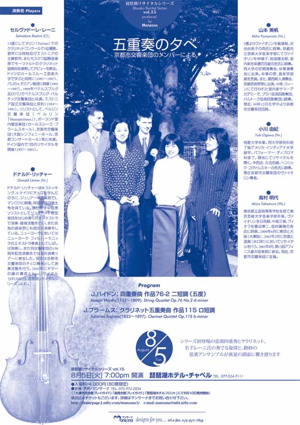 Quintette Selvadore Raehni (Cl.) Donald Litcher (Vc.) Miho Yamamoto (Vn.) Yuki Ogawa (Vn.) Akiyo Takamura (Vla.) Augt.-5, 2003