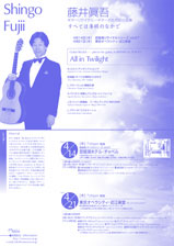 Shingo Fujii was born in Kamiiso (Japan) in 1954, began to study the guitar by himself at the age of ten, and then under the direction of Ichiro Okamoto. As a student at Kyoto University he won 1st prize in the "Young Guitarist Competition (Osaka, 1978)". He went to Spain to study under the late Joseluis Gonzalez and David Russell, and in 1986 obtained the diploma of the Royal College of Music, London (A.R.C.M.) and won the "Luis-Coleman Prize" in the "Luis Coleman Competition (Santiago de Compostella)". He now gives numerous concerts throughout Japan, is invited to a number of music festivals, and has taught at the Osaka College of Music from 1986 to 2000. He wrote a series of articles for a guitar course based on L. Brouwer's Studies for the monthly magazine; Gendai Guitar for two years, and has been guest lecturer at the "Kyushu Summer Course for Guitar" since 1998. Shingo was teaching Guitar and Guitar Ensemble. From 1998, Shingo is invited as a Guest Teacher of Guitar and Guitar Ensemble in KYUSHU GUITAR SUMMER COURSE, and a Guest teacher in FOREST-HILL MUSIC ACADEMY(Fukuoka). |