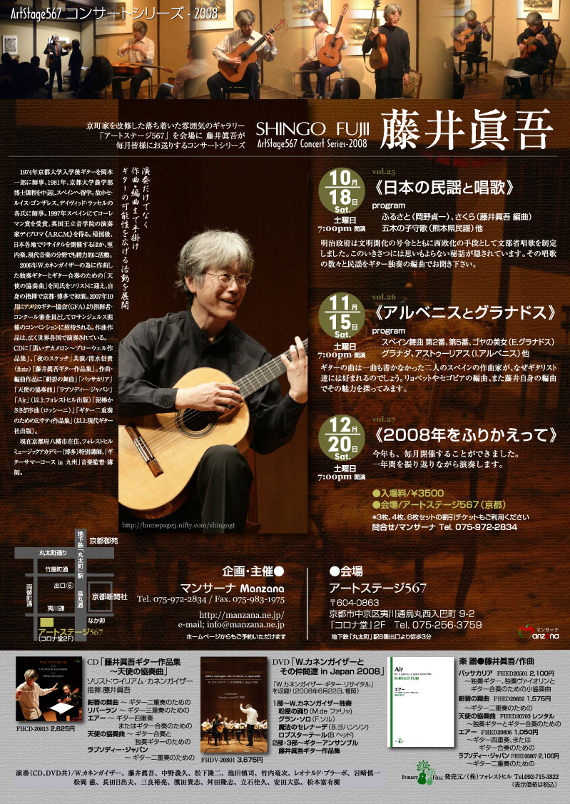 〜京都の烏丸夷川にある ArtStage567 を舞台に藤井眞吾が毎月お贈りするコンサートシリーズ。大会場でのリサイタルとは違った雰囲気、プログラムで、クラシックギターの味わいをお楽しみ下さい。