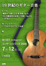 ●program F.ソル(1778-1839) ・魔笛の主題による変奏曲 Op.9 ・24の漸進的小品集(全曲)Op.44 M. ジュリアーニ(1781-1829) ・二つのアイルランド民謡 Op.125 M.カルカッシ(1792-1853) ・25の旋律的且つ斬新的練習曲集 Op.60より J.K.メルツ(1806-1856) ・序奏と華麗なロンド Op.11 〜19世紀のギター愛想曲集 ・ソル《月光》 ・コスト《舟唄》《練習曲 二短調》 ・メルツ《ロマンス》