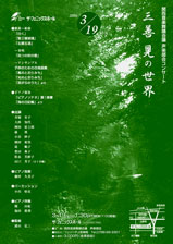 晃の世界関西音楽舞踊会議 声楽部会コンサート ●日時/2006年3月19日[日] 1:30pm開演 (1:00pm開場) ●出演/井塚有子、大西知代、岡田征士郎、康瑛、小谷妙子、園田裕美、堤順子、豊田典子、松永芙紗子、山口芳子(五十音順) ●ピアノ独奏 /藤村久美子 ●パーカッション/小川悟史 ●ピアノ伴奏/ 関由紀、福田眞理 ●監修/浦山弘三 ●会場/ザ・フェニックスホール(Tel.06-6363-7999)●入場料/3,000円(全自由席) ●主催/関西音楽舞踊会議 声楽部会 ●問合せ/フェリーチェ音楽院 Tel.0798-69-3301 ●program/歌曲〜組曲 「白く」「聖三稜玻璃」「五柳五酒」 /〜重唱 「四つの秋の歌」 /〜アンサンブル 子供のための合唱曲集 「風のとおりみち」「光のとおりみち」「貝がらのうた」より /ピアノ独奏 「ピアノソナタ」第1楽章 「海の日記帳」より |