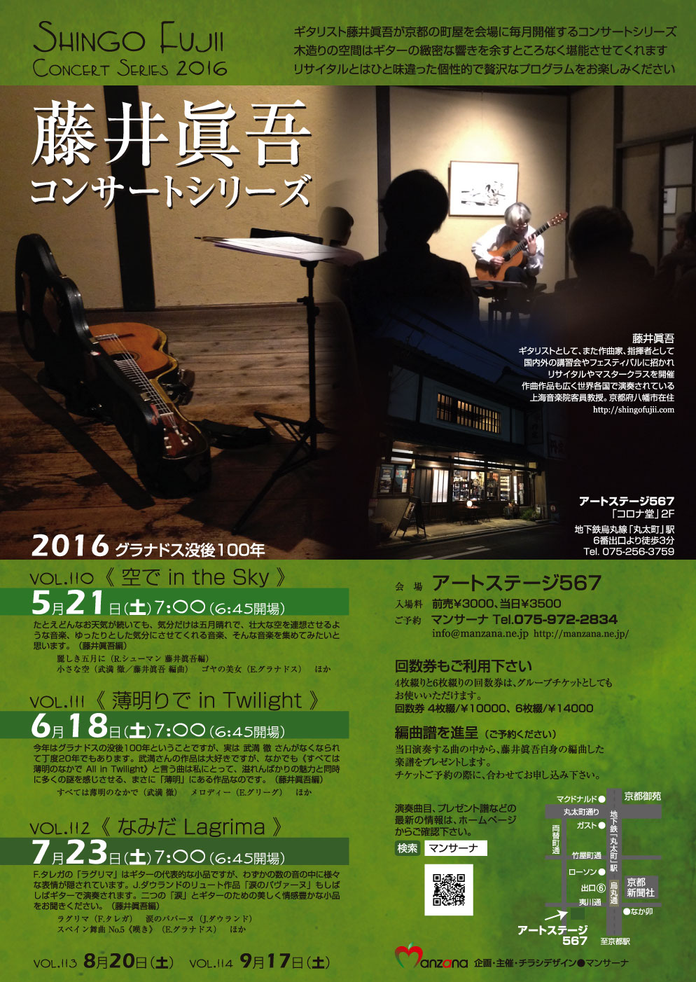 ●チケット/\3000 当日¥3500 4回券¥10000 6回券¥14000 ●主催/ マンサーナ Manzana Tel.075-972-2834 ●企画 /藤井眞吾/ http://homepage3.nifty.com/shingogt/ ●会場/アートステージ567